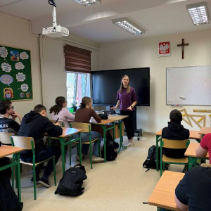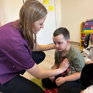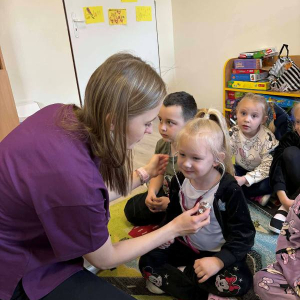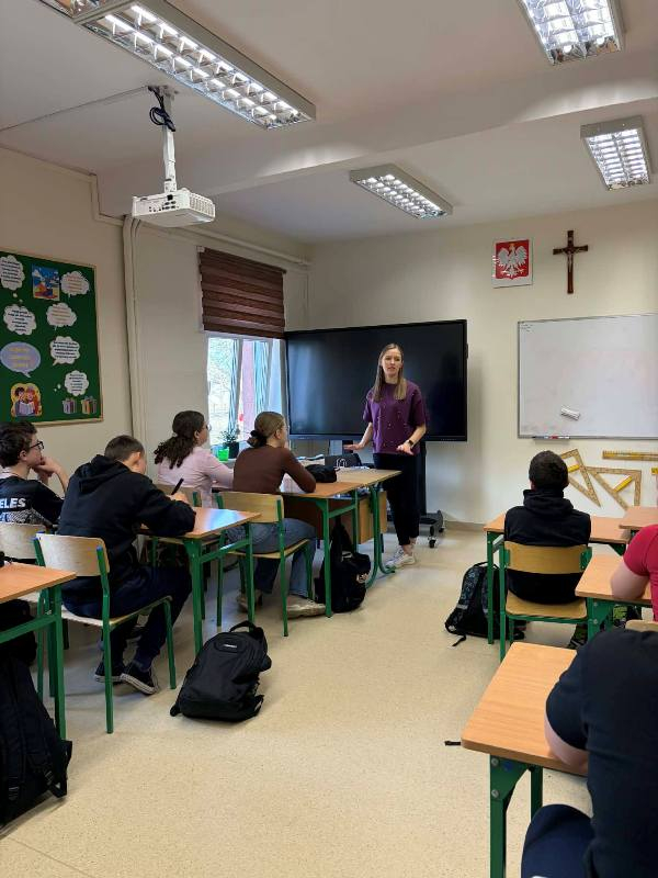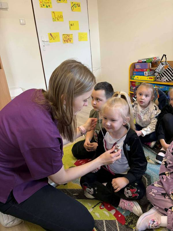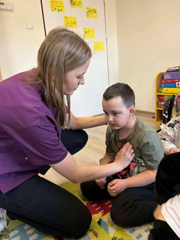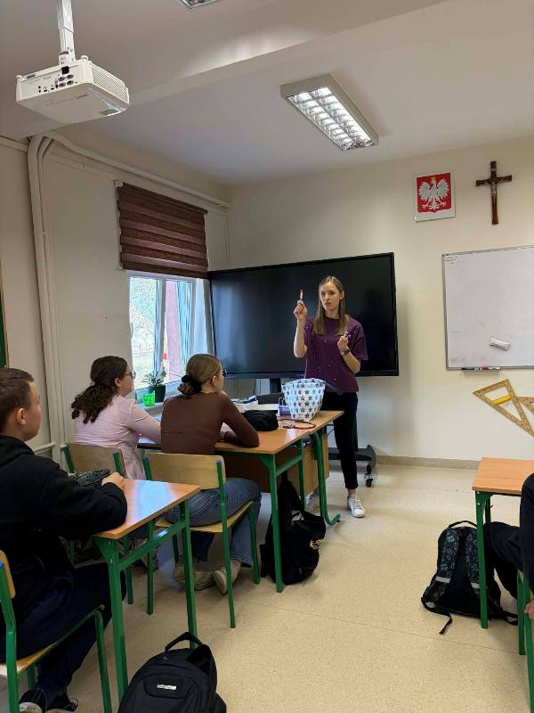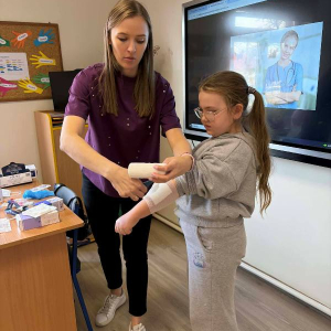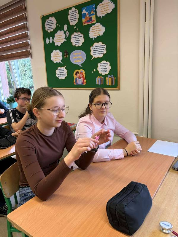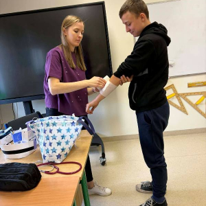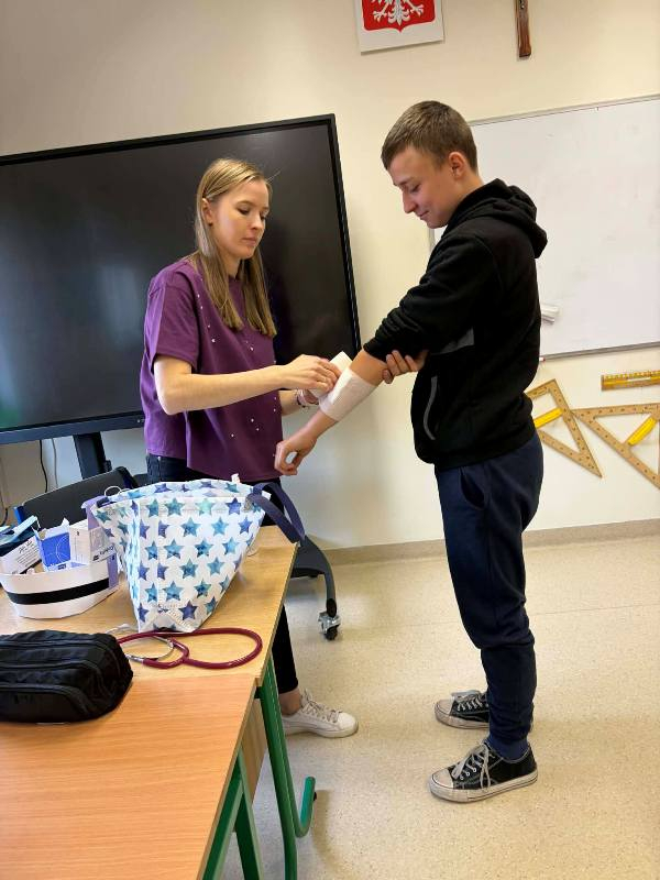 We wtorek 10 marca odbyło się spotkanie uczniów z panią Kingą Rainer, pielęgniarką pracującą na Oddziale Kardiologicznym w Zespole Zakładów Opieki Zdrowotnej w Ostrowie Wielkopolskim. Celem wizyty było przybliżenie uczniom specyfiki zawodu pielęgniarki oraz zapoznanie ich z podstawowymi czynnościami medycznymi wykonywanymi w codziennej pracy. Podczas spotkania pielęgniarka opowiedziała o swojej pracy, obowiązkach oraz odpowiedzialności związanej z opieką nad pacjentami. Uczniowie mieli okazję dowiedzieć się, jak wygląda praca na oddziale kardiologicznym oraz jakie umiejętności i cechy są potrzebne, aby wykonywać ten zawód. Dużym zainteresowaniem cieszyła się część praktyczna. Pielęgniarka zaprezentowała działanie pulsometru i pokazała, w jaki sposób mierzy się tętno oraz monitoruje pracę serca. Uczniowie mogli również zobaczyć, jak prawidłowo bandażować rany, a niektórzy z nich spróbowali samodzielnie wykonać opatrunek pod czujnym okiem specjalisty. Spotkanie było bardzo ciekawe i pouczające. Uczniowie z dużym zaangażowaniem uczestniczyli w zajęciach, zadawali pytania i chętnie brali udział w pokazach praktycznych. Dzięki temu wydarzeniu mogli lepiej poznać zawód pielęgniarki oraz zdobyć cenną wiedzę z zakresu pierwszej pomocy i dbania o zdrowie.