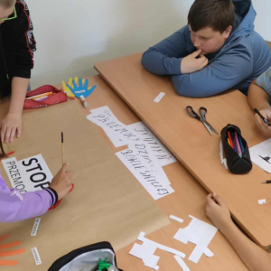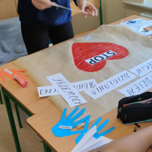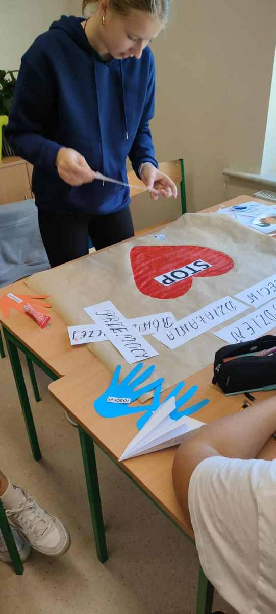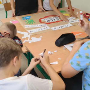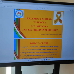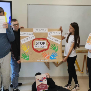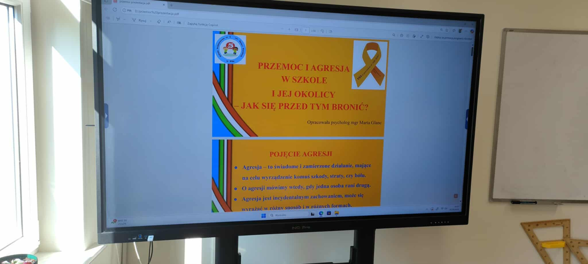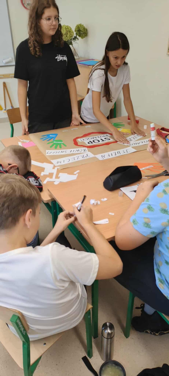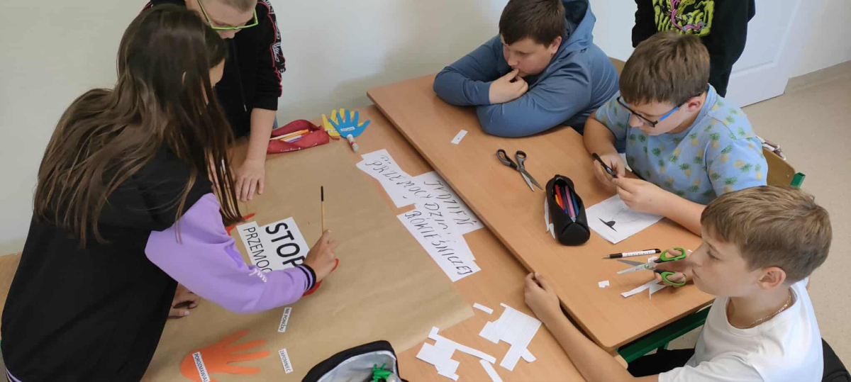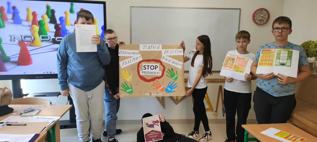 Celem zajęć przeprowadzonych w klasach IV – VII było zwiększenie świadomości uczniów na temat różnych form przemocy i agresji: fizycznej, psychicznej, werbalnej, cyberprzemocy oraz kształtowanie postaw opartych na empatii, odpowiedzialności i wzajemnym szacunku. Uczniowie poznali sposoby reagowania w sytuacjach trudnych, omówiono również procedury zgłaszania przemocy.W trakcie zajęć poruszono kluczowe zagadnienia: definicję przemocy i agresji, ich rodzaje, a także sposoby reagowania. Uczniowie aktywnie uczestniczyli w dyskusjach, z dużym zaangażowaniem odnosząc się szczególnie do tematu cyberprzemocy. Chętnie dzielili się swoimi doświadczeniami i wykazywali dużą dojrzałość w analizie przedstawianych sytuacji. Podsumowaniem działań było przygotowanie przez uczniów plakatów i haseł promujących bezpieczną i przyjazną szkołę.
