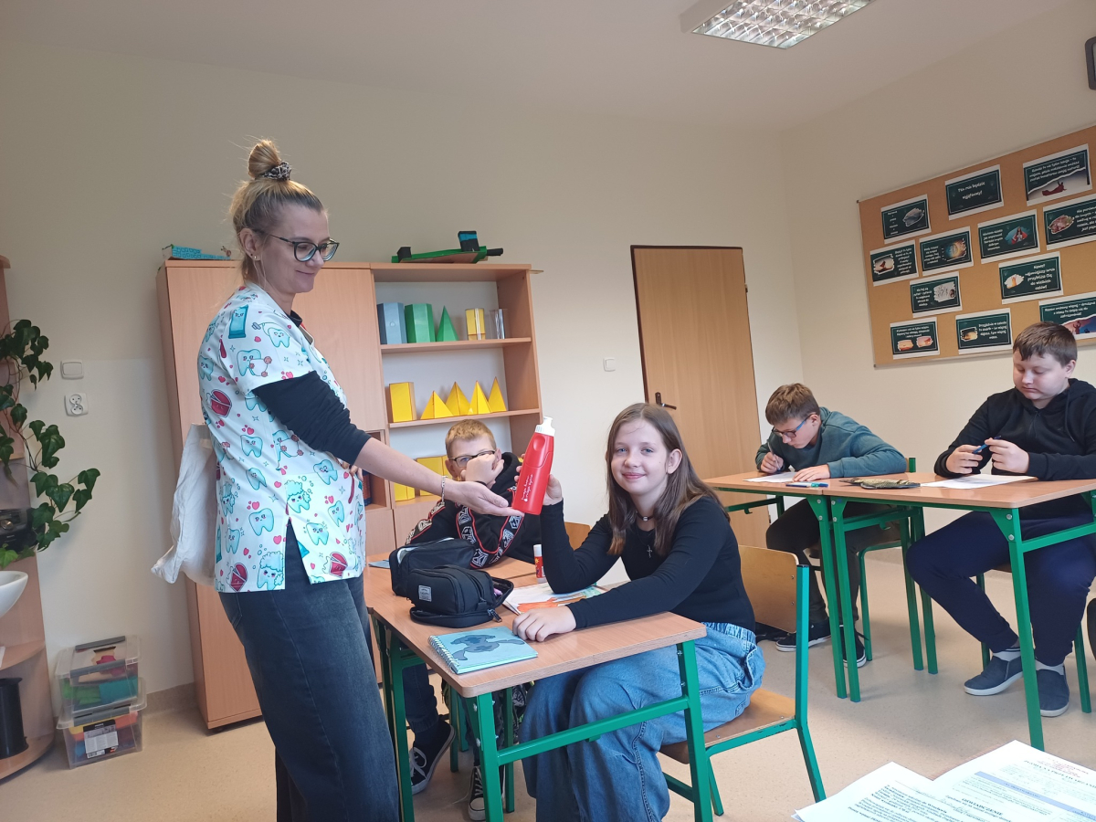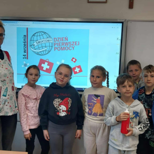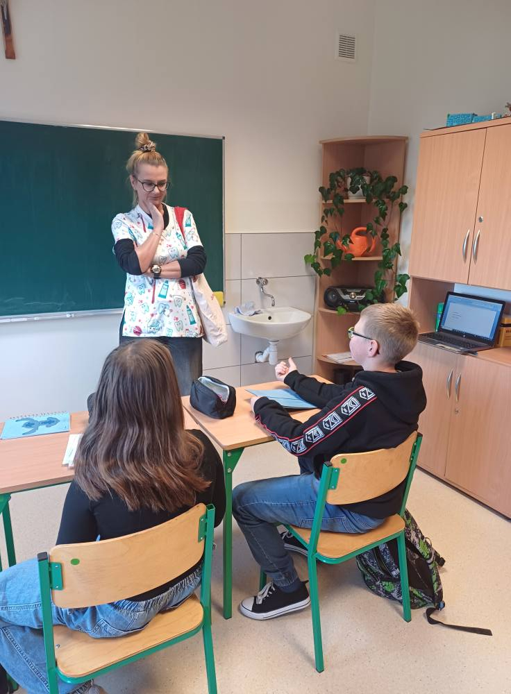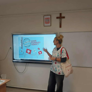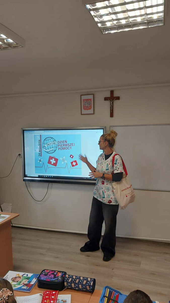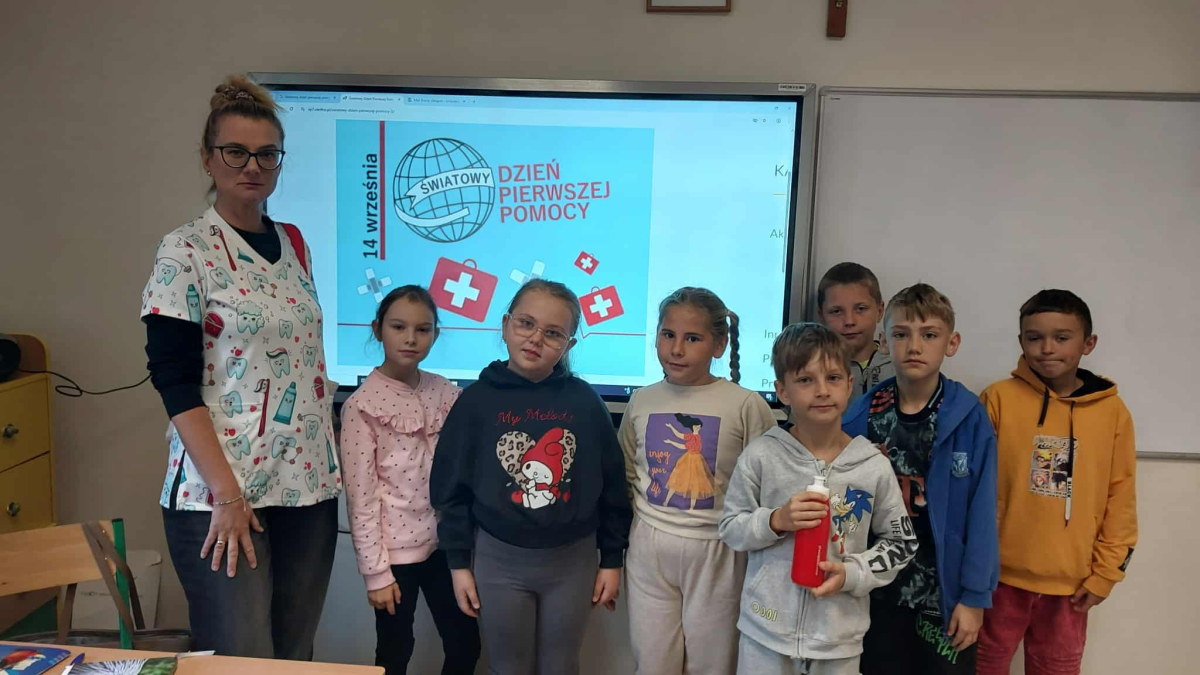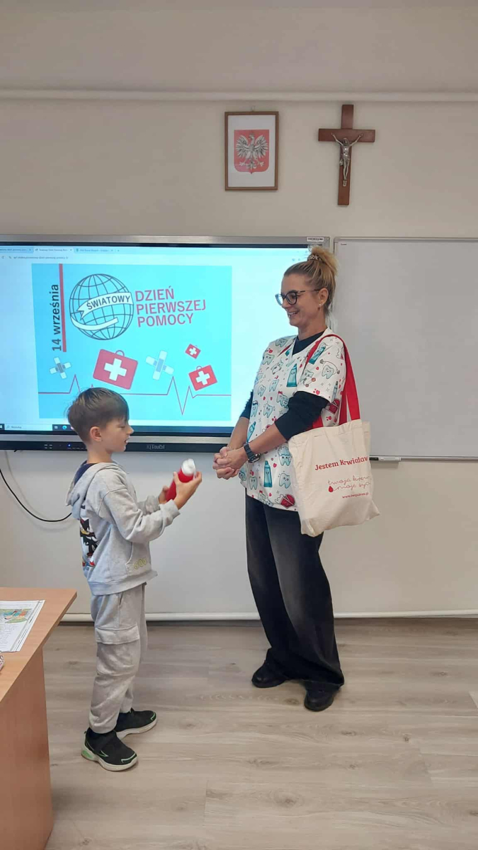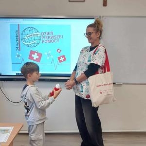 Z okazji Dnia Pierwszej Pomocy w naszej szkole odbyły się spotkania pielęgniarki szkolnej z uczniami wszystkich klas. Celem zajęć było zwiększenie świadomości na temat zasad udzielania pierwszej pomocy oraz kształtowanie postaw odpowiedzialności i gotowości do niesienia pomocy. Uczniowie obejrzeli prezentację multimedialną, a pielęgniarka przekazała im najważniejsze informacje dotyczące postępowania w sytuacjach zagrożenia zdrowia lub życia. Na zakończenie najbardziej zaangażowani uczniowie otrzymali drobne upominki w ramach podziękowania za aktywny udział.